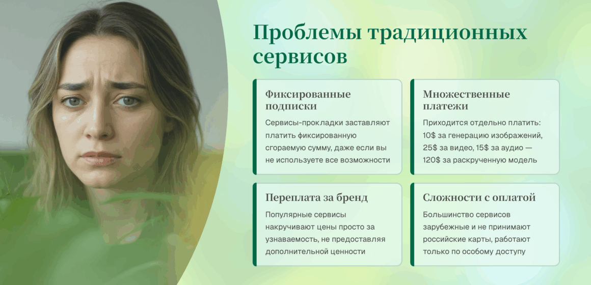 Единая точка доступа ко всем нейросетям через простой интерфейс. Больше никаких регистраций на десятках сайтов, никаких сложных настроек, никаких технических барьеров. Один клик — и ты внутри любой нейросети, которая тебе нужна.