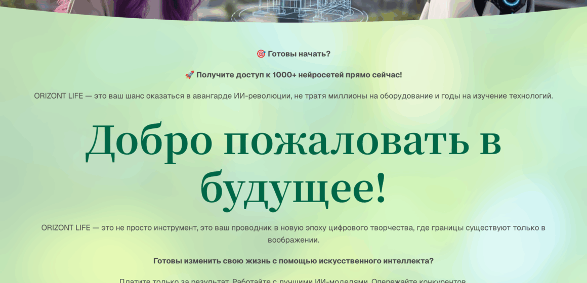Я хочу тебя познакомить с ORIZONT.life — первую в мире экосистему, которая дает тебе мгновенный доступ к более чем 1000 специализированных нейросетей без программирования, дорогого оборудования и технических знаний.